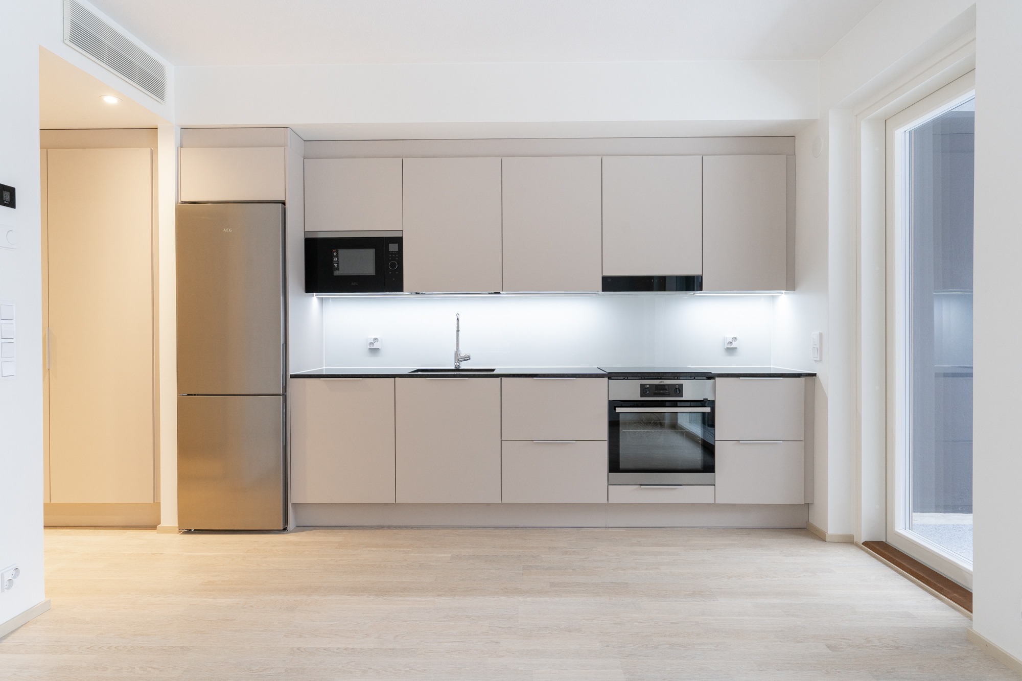 Verka on selkeä skandinaavinen tyylikonsepti, jossa kaunis puupinta rytmittää sulavasti valkoista värimaailmaa. Keittiön kaapinovissa on sileä, kiiltäväpintainen valkoinen MDF ja tasot ovat valkoista kvarsikomposiittia. Lattiaksi on valittu asunnosta riippuen klassinen tammi- tai saarniparketti.