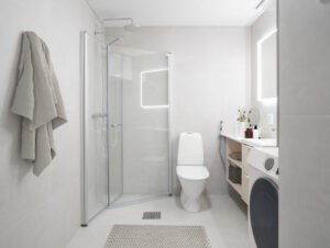 Pesuhuoneiden laatat ovat reilun kokoista 60×60 cm laattaa ja katseenvangitsijana löytyy led valoin varusteltu peili. Jokaisessa kylpyhuoneessa on tilavaraus pyykinpesukoneelle ja kuivausrummulle.
