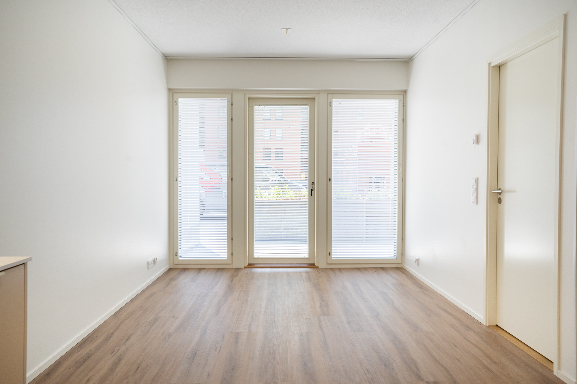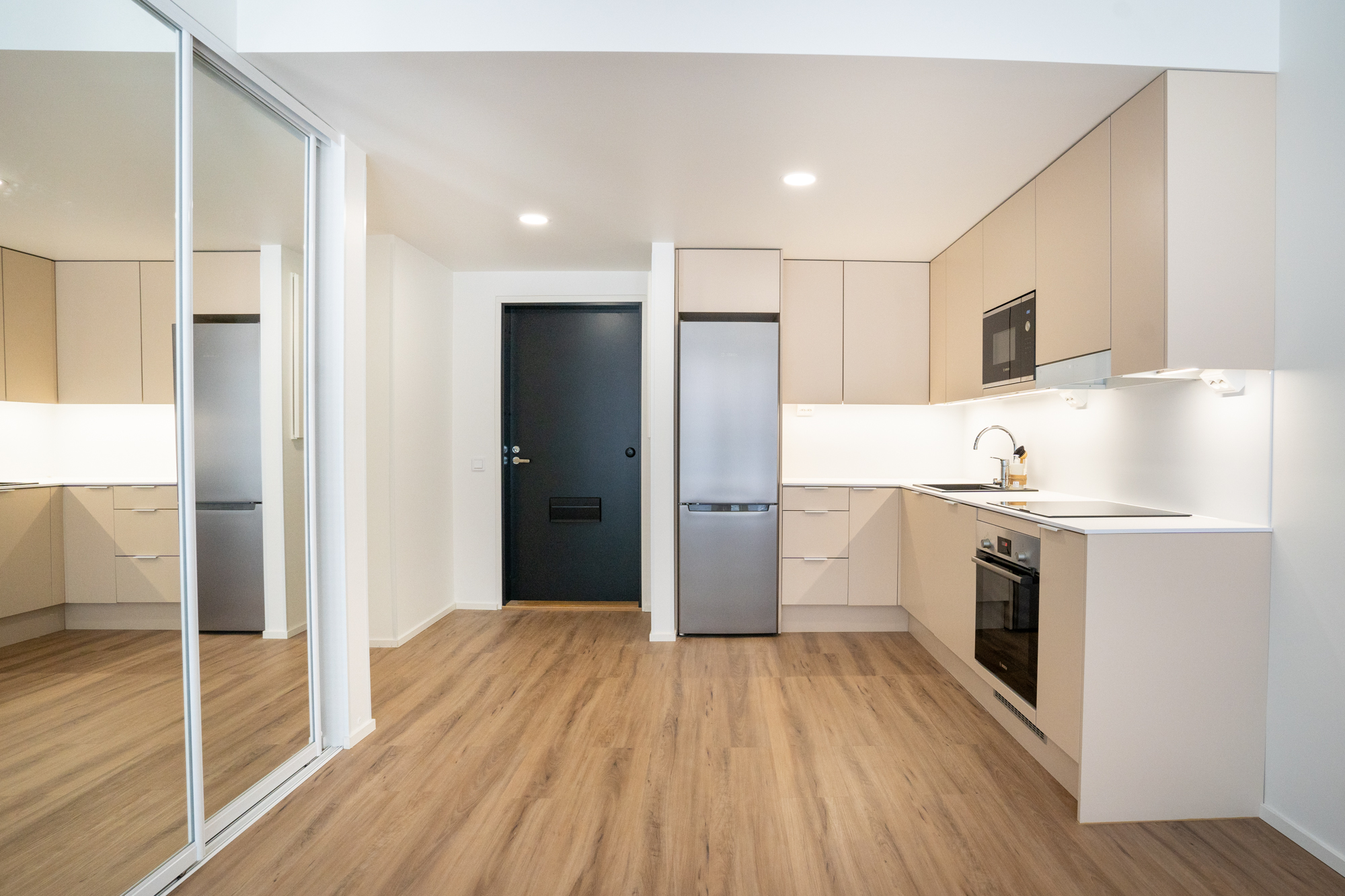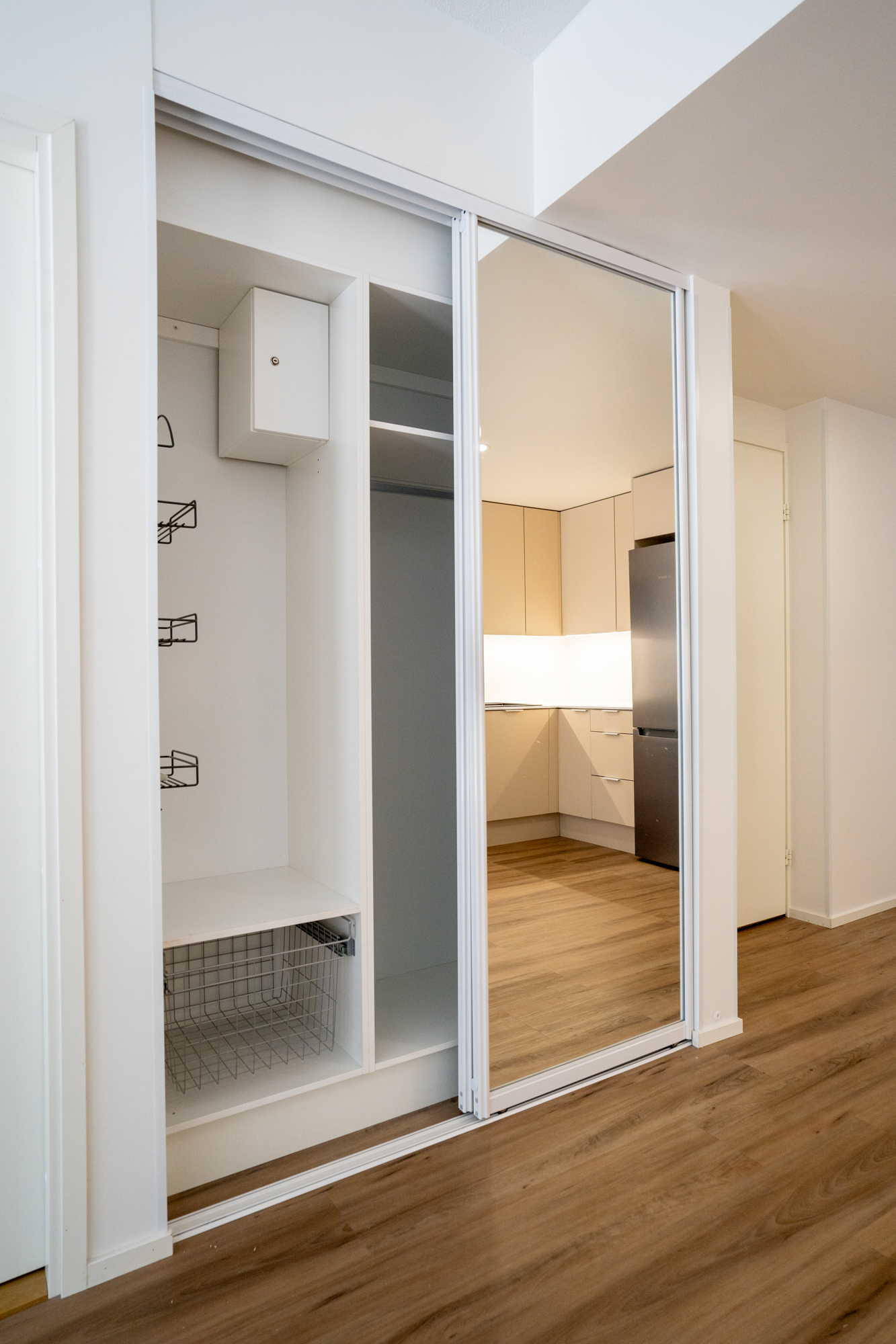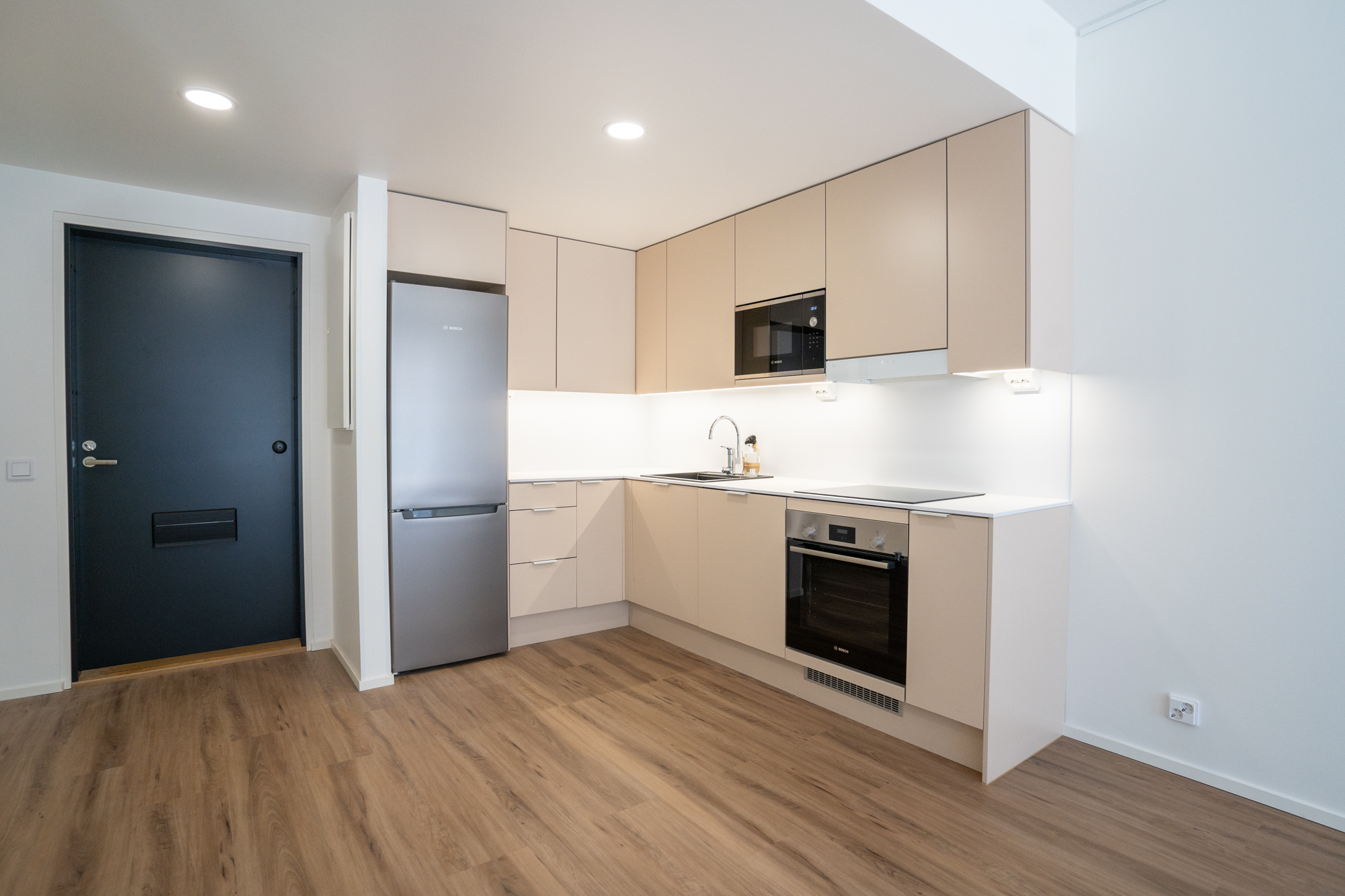 Asuntojen eteisestä löytyy peililiukuovikomerot ja asuintilojen lattiamateriaalina on käytetty vinyylilankkua. Keittiön Boschin kodinkoneet ovat integroitu ja varusteluna löytyy astianpesukone, mikroaaltouuni sekä induktioliesi. Keittiön työtasot ovat 12 mm kompaktilaminaattitasoja ja altaat tasoon upotettuja komposiittialtailta.