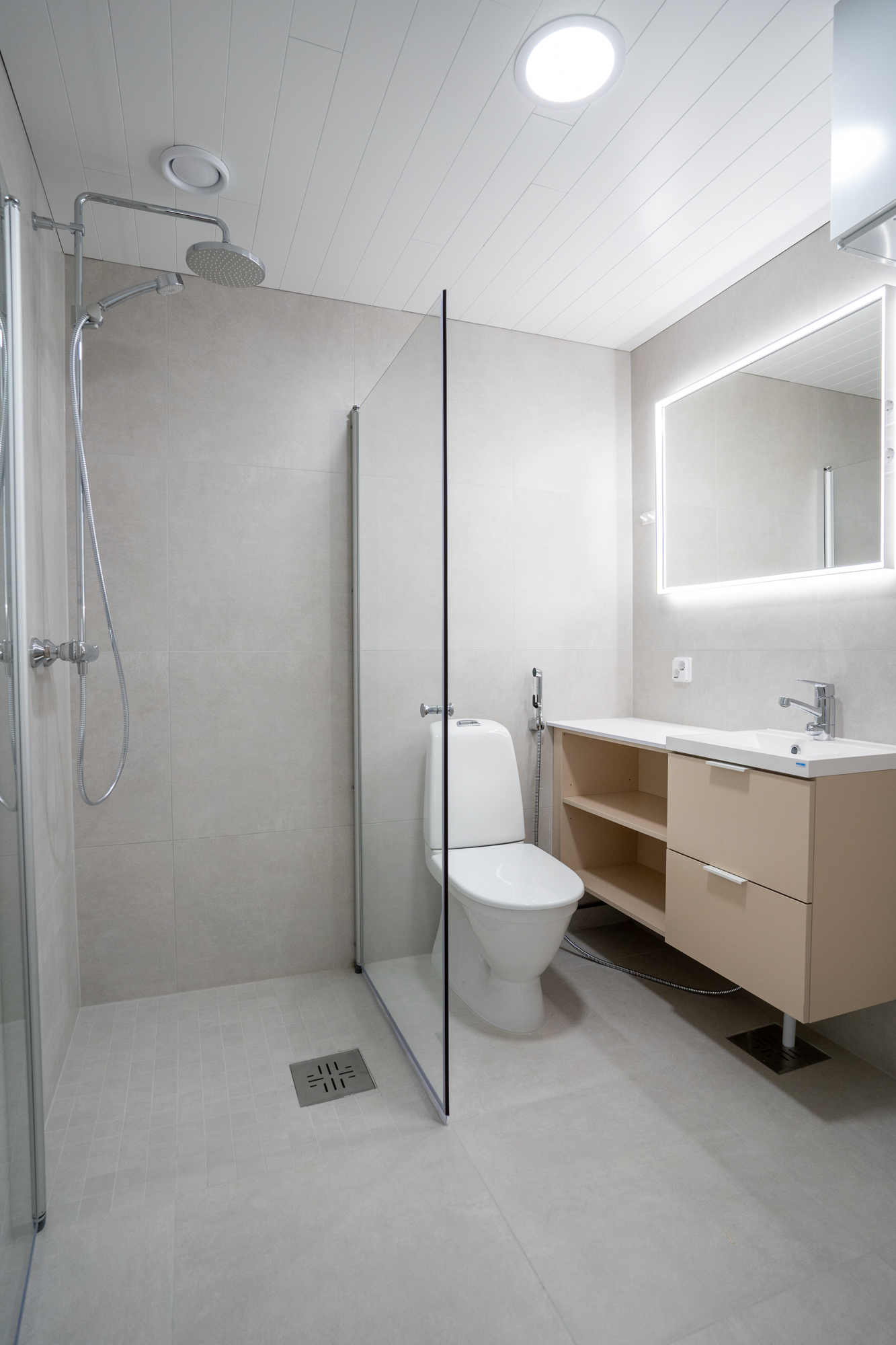 Pesuhuoneiden laatat ovat reilun kokoista 60×60 cm laattaa ja katseenvangitsijana löytyy led valoin varusteltu peili. Jokaisessa kylpyhuoneessa on tilavaraus pyykinpesukoneelle ja kuivausrummulle.